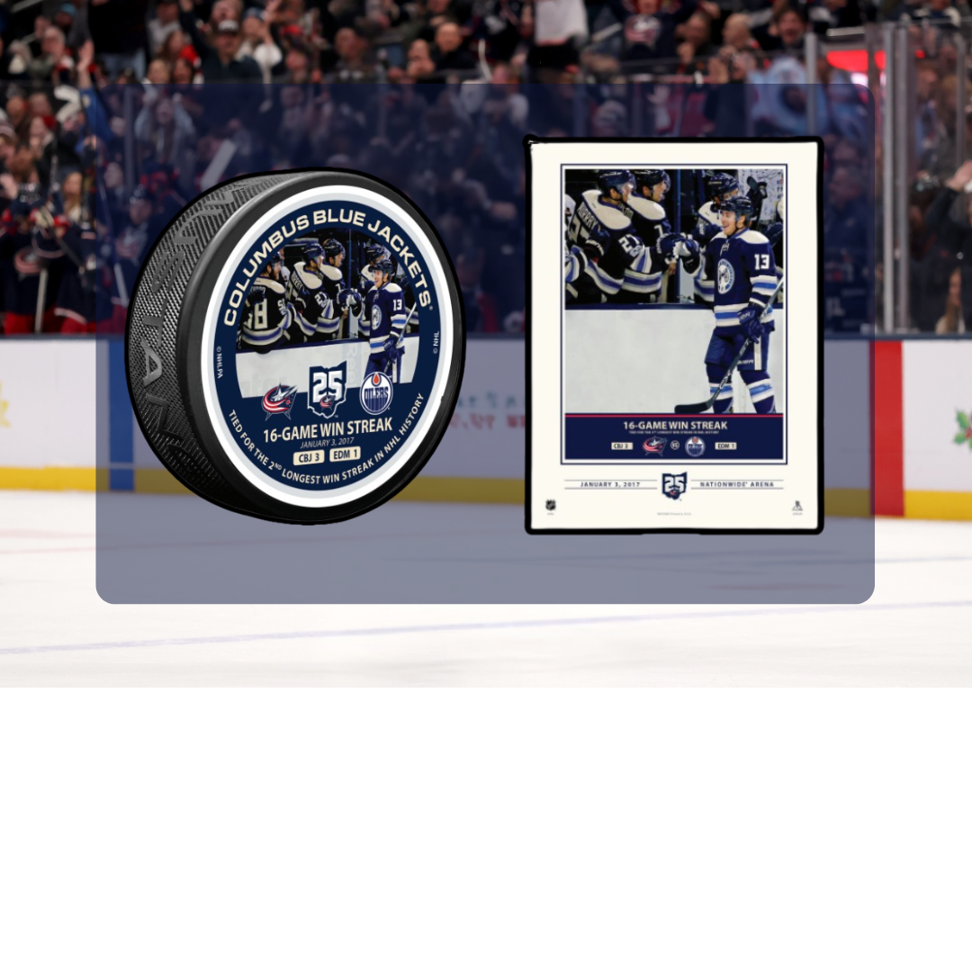 Celebrate the Jackets’ historic 16-game win streak with this limited-edition poster and puck. Part of the 25th Anniversary Collection—available now online and in the Main Team Store while supplies last.